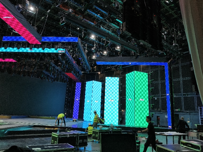 An indoor production venue in Cukarica Urban Municipality, Serbia, is depicted during setup. The scene features a multi-tiered stage with a large, dark blue LED screen backdrop. Overhead, an extensive rigging system supports numerous stage lights and several horizontal LED screens displaying checkered patterns in pink, blue, and cyan. One overhead screen displays "MK Media". On the stage, five vertical LED pillars exhibit checkered patterns in purple, cyan, and green. A vertical blue LED strip frames the right side of the stage structure. Approximately five male personnel are present. Two men, wearing yellow-green high-visibility vests and hard hats, are actively working on the stage floor; one is bent over on the left, and another is near the base of a central LED pillar. A third man, dressed in a black t-shirt and dark pants, walks across the foreground from left to right. In the background on the right, two additional individuals are visible, one seated at a metal table covered with papers, and another standing further back. Numerous black equipment cases are scattered across the foreground and near the stage. Overhead, large black speaker arrays are suspended from the ceiling. The environment is characterized by high ceilings, exposed trusses, and extensive cabling, indicative of a large-scale event or television production setup.