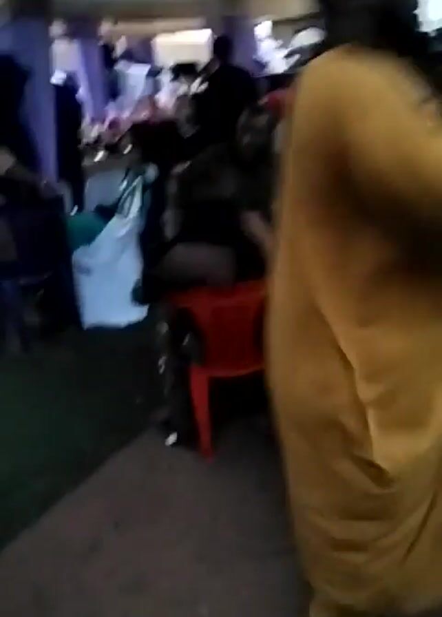Several people are seen lying on the ground in what appears to be a public setting. The camera angle is overhead, moving slightly. Some individuals are covered with cloth. Other people are dressed in casual clothing and some wear shoes or sandals. A shelf or low wall painted purple is visible, along with a green surface resembling artificial turf. The scene appears chaotic, with the people seemingly disoriented. The overall impression is one of disarray and possible distress.