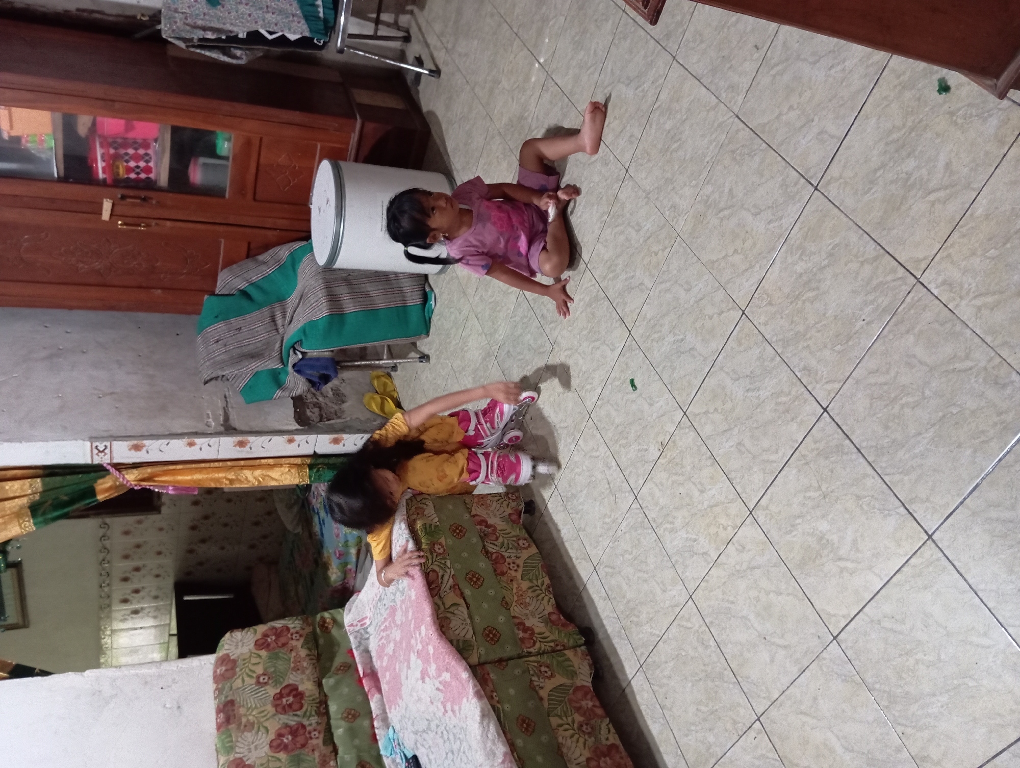The image depicts an indoor scene in a residence located in Baron, Indonesia. Two young girls are present on a light-colored tiled floor. On the left, a girl, estimated to be 6-8 years old, wears a yellow long-sleeved shirt, yellow pants, and pink and white inline skates on both feet. She is leaning with her forearms on a floral-patterned sofa covered with a white and pink patterned blanket. A dark remote control is visible on the blanket. To her right, a younger girl, estimated to be 3-5 years old, sits barefoot on the tiled floor, wearing a pink short-sleeved top and matching shorts. Her dark hair is styled in two pigtails, and she is looking towards the right side of the frame. Small green fragments are scattered on the floor. In the background, a dark wooden cabinet with carved details and glass doors displays various colored plastic containers. Adjacent to the cabinet are a white cylindrical storage bin with a gray lid and a metal chair draped with a green and white striped fabric. An open doorway on the far left reveals an adjoining room with patterned wallpaper, a bed with a blue and white patterned mattress, and a hanging picture frame. A yellow and green patterned curtain hangs in another doorway, secured with a pink tie.