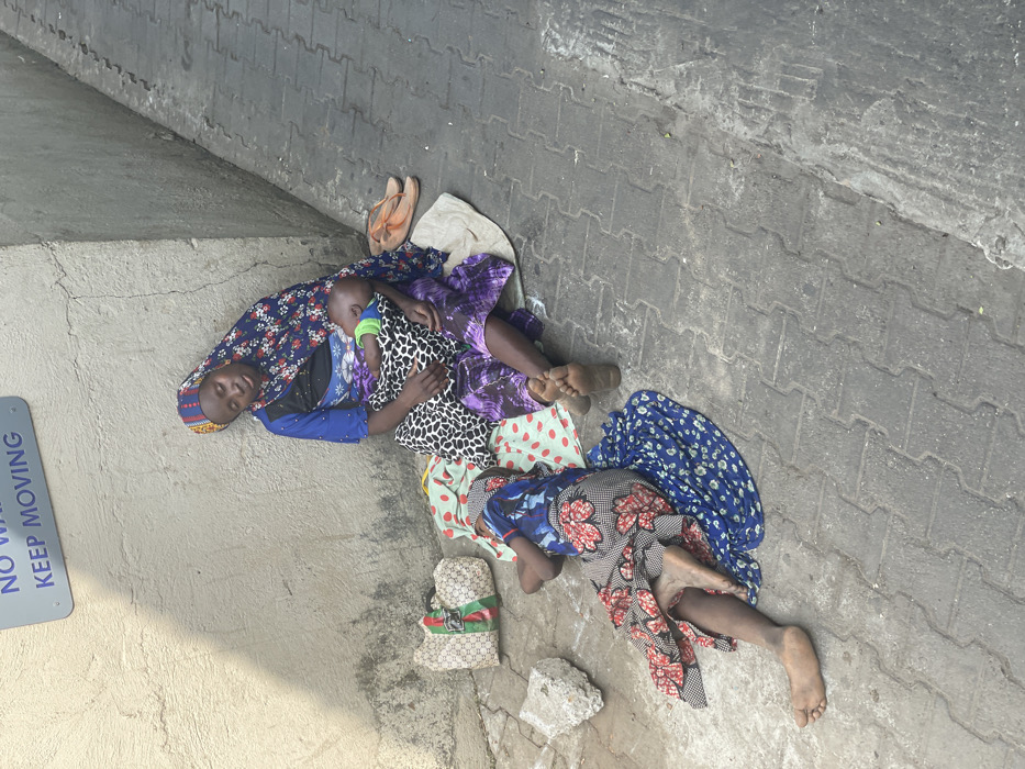 An adult female, an infant, and a child are observed resting on a grey interlocking paver sidewalk against a light-colored, textured wall in an urban area of Abuja, Nigeria