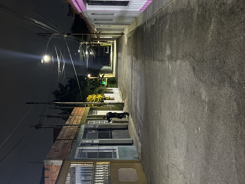 A narrow street stretches into the night, flanked by buildings of varying heights and colors. A person stands near the building on the left side. Overhead, power lines tangle across the sky, illuminated by distant streetlights. The street surface is uneven and textured, reflecting the ambient light. The overall scene is dimly lit.