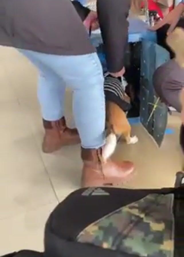 A person wearing light blue jeans, a dark jacket, and brown boots is trying to pull a beagle puppy with a black and white striped sweater out of a blue box. The puppy is resisting. Another person holds a cell phone pointed at the scene. A black and green Adidas backpack is visible in the foreground. The floor is a light-colored tile.