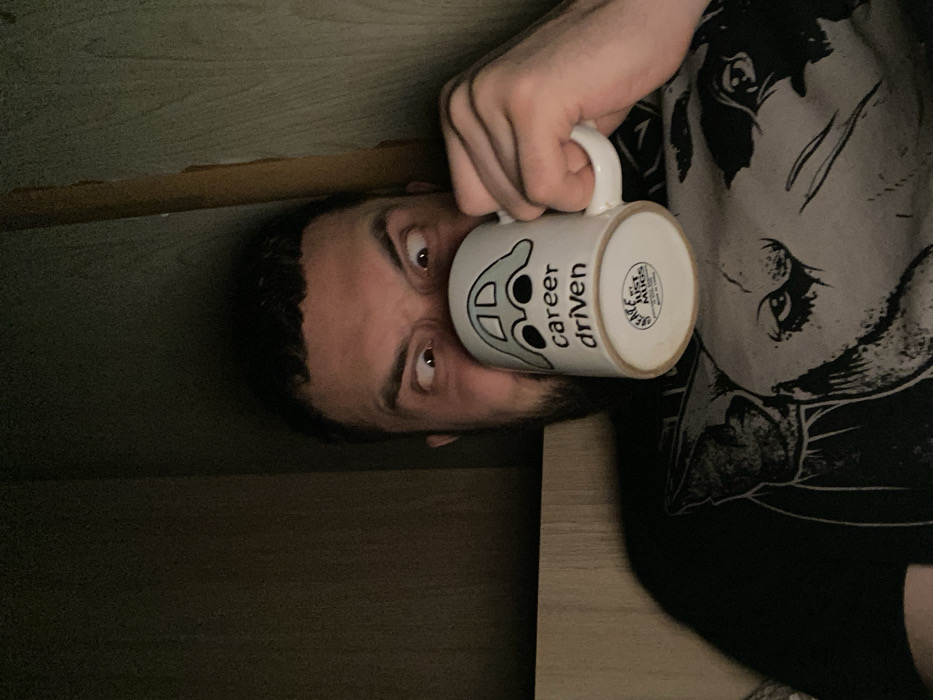 A bearded man with piercing eyes holds a white mug close to his face. The mug has the words "career driven" and an abstract design. The man wears a black t-shirt with a grayscale portrait. The setting is dimly lit, showing dark wood paneling above and a dark surface below. The photo is rotated, presenting a disorienting perspective.