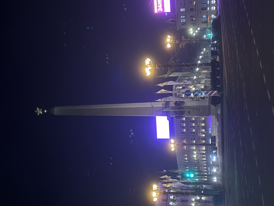 A tall obelisk with a gold star on top dominates the dark, night sky. The structure stands in a city square, flanked by illuminated buildings and rows of lampposts. Flags are displayed along the square. A large, bright rectangular screen is affixed to the obelisk. The scene is lit with various artificial lights, creating a mix of blue, yellow, and white hues.