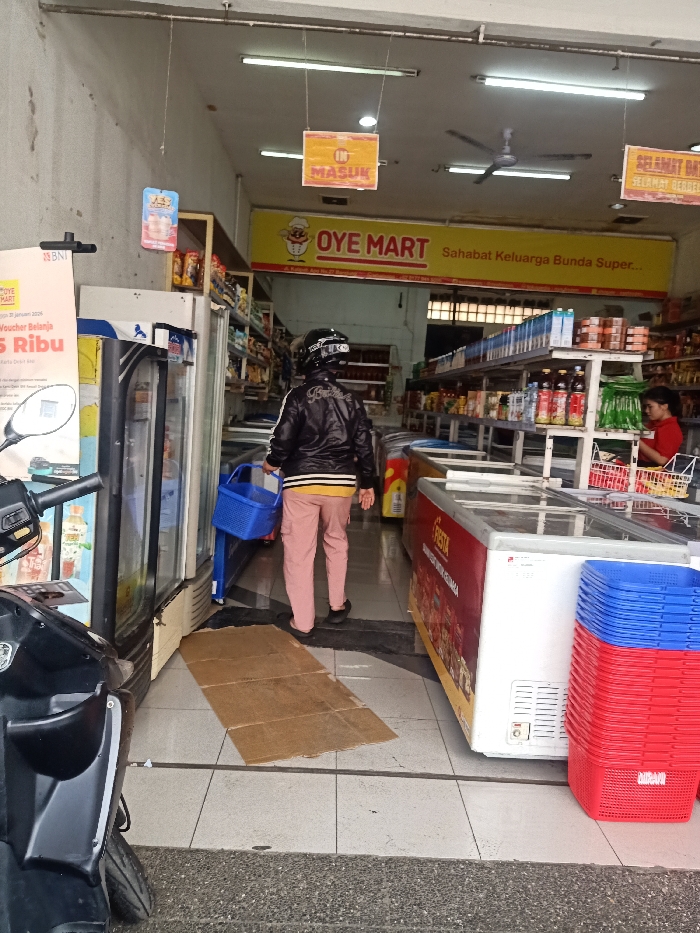 A person wearing a helmet, black jacket, and pink pants walks into "OYE MART" holding a blue shopping basket. The store sign reads "Sahabat Keluarga Bunda Super..." Inside, shelves are stocked with groceries, and a woman in a red shirt stands at the checkout. Stacks of red and blue shopping baskets sit beside a freezer. A sign above the entrance says "MASUK" and "SELAMAT DAT". A scooter is parked outside, near a sign that reads "Voucher Belanja 5 Ribu".