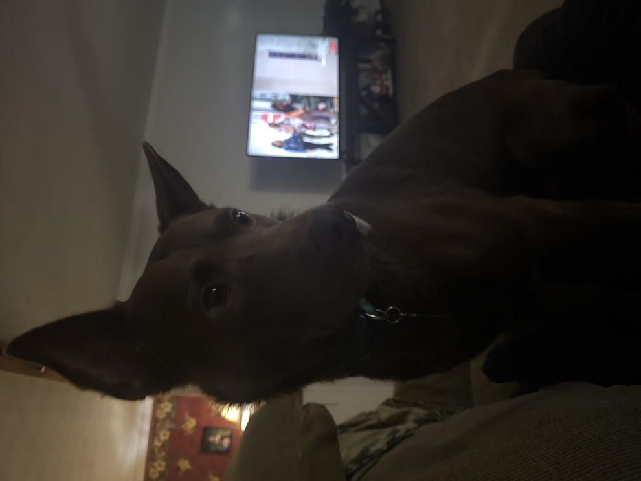 The image portrays an interior residential scene in Unknown, United States. In the immediate foreground, a dark brown dog, with erect, pointed ears and wearing a teal collar fitted with a silver O-ring and a dangling metallic charm, is seated on a light-colored upholstered surface. The dog's head is slightly turned to the right, exhibiting visible, reflective eyes; its body is largely obscured by shadow. To the left of the dog, a wall covered in red and gold floral wallpaper is visible, featuring a framed item that reflects light. In the mid-ground, a flat-screen television is displaying a scene with three individuals, one wearing a blue jacket, and a red circular sign. The television rests on a dark-colored entertainment console, with indistinct items visible beneath it. The wall behind the television is plain and light-colored. The overall environment is dimly lit, with the television screen serving as a prominent light source.