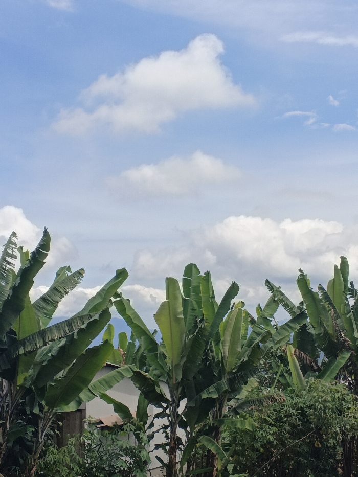 The image captures an outdoor scene within the city of Đăk La, Vietnam, primarily featuring a sky and dense tropical vegetation. The upper approximately two-thirds of the frame consists of a light blue sky populated by numerous white cumulus clouds, varying in size and density. The lower portion of the frame is dominated by the large, broad green leaves of multiple banana plants, some of which exhibit minor fraying along their edges. Interspersed among the banana foliage, particularly in the lower left, a section of a light-colored building with a dark, sloped roof is visible. Additional dense, dark green shrubbery and smaller plants are present beneath the banana plants in the foreground. No individuals, actions, or interactions are visible.