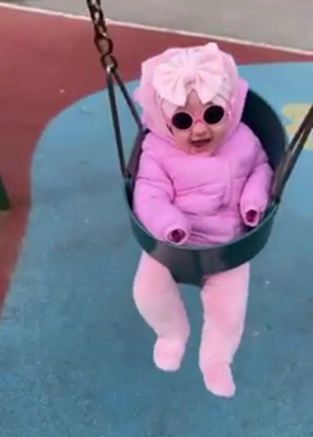 A baby swings in a green bucket swing at a park with a blue and red ground, smiling and wearing a pink outfit with a matching pink bow headband and pink sunglasses