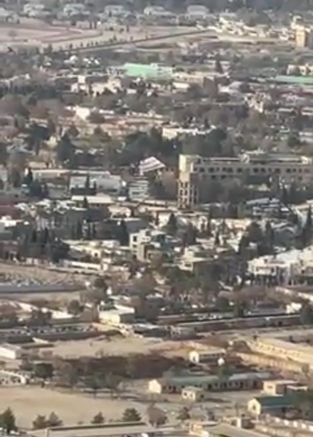 n aerial view of a densely populated city, followed by a wider shot from a hilltop overlooking the cityscape. The city features buildings of various sizes, interspersed with trees and open spaces. The overall color palette is muted, with shades of brown, grey, and beige dominating the landscape. The sky is blue with scattered clouds. The hilltop in the second shot is barren and rocky, with some sparse vegetation. There are no people visible in either shot.