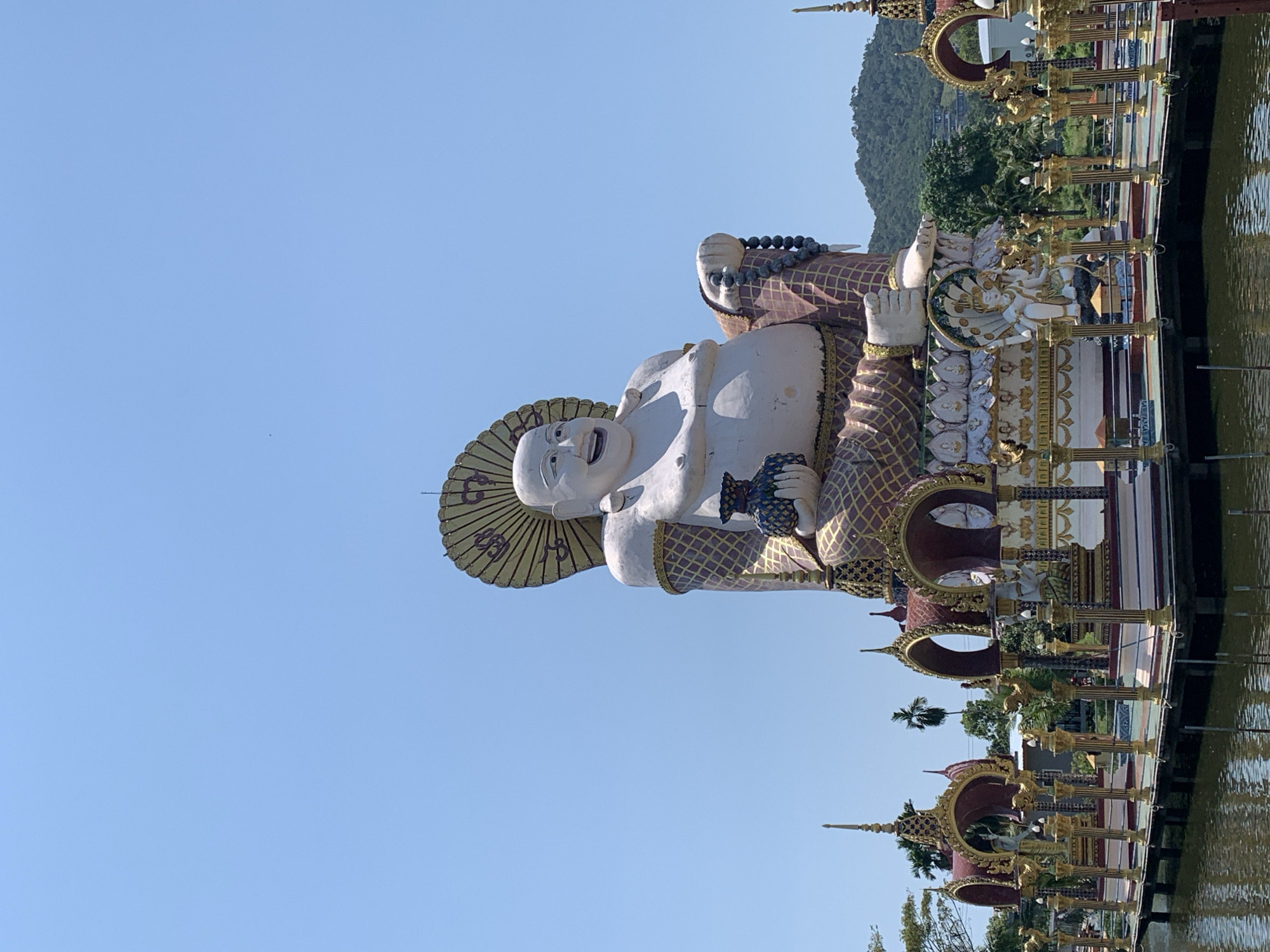 A large, multi-story statue of a seated, smiling Budai (Happy Buddha) is centered outdoors under a clear, bright blue sky in Baan Plai Laem, Thailand. The statue's skin is white or light cream, with a prominent belly, and its robes are patterned in reddish-brown and gold. The figure holds a blue and gold patterned vase in its left hand and a string of dark beads in its right. A large, golden, fan-like halo with intricate patterns is positioned behind its head. The statue is situated on a multi-tiered, ornate base adorned with smaller white figures, including one with multiple snake heads, and further golden and white decorative elements. The statue's base rests on an elevated platform system extending over dark water. This platform is bordered by multiple ornate golden pillars, each topped with a light fixture, and interspersed with red and gold arched structures. In the background, lush green hills and scattered palm trees are visible under direct sunlight. No individuals are visible in the immediate vicinity.
