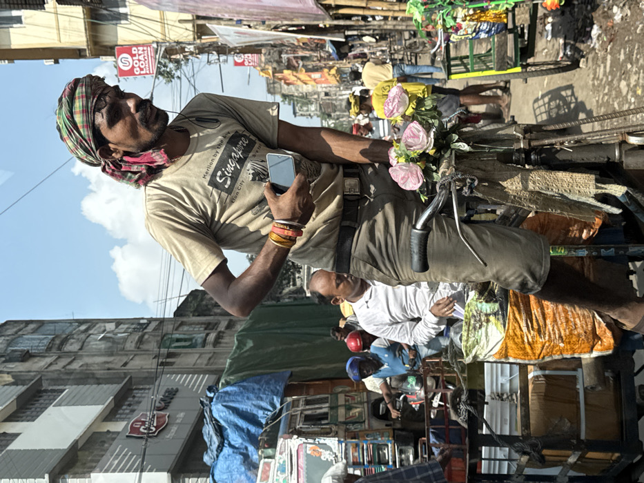 This image depicts a bustling street scene in an urban area of Kolkata, India, under clear daylight. In the foreground, a dark-skinned adult male is positioned on what appears to be a cargo bicycle or cycle rickshaw. He wears a light tan short-sleeved t-shirt with a "Merlion by the Bay Singapore Lion City" graphic, olive green shorts, and a black belt with a silver buckle. A red and green plaid cloth is wrapped around his head as a turban. His right wrist is adorned with multiple colorful bangles (orange, yellow, red, black). He holds a silver-colored smartphone in his right hand, screen facing away from the viewer, with his thumb positioned across the screen. An earbud is visible in his left ear. The handlebars of his bicycle are decorated with three artificial pink roses, and bundles of coarse fabric are tied to the front. He looks towards the viewer's left with a neutral expression. In the midground, to the left of the main subject, the cab of a multi-colored, decorated truck is partially visible, covered by a blue tarpaulin. Behind the main subject, another man in a light blue vest and dark blue cap sits on a red scooter, looking left. Next to him, a bald man in a white collared shirt stands, looking downwards, potentially interacting with goods on an adjacent cargo bicycle or rickshaw, which carries white plastic buckets, cardboard boxes, and an orange sack. The background reveals a narrow, busy street lined with multi-story buildings. On the left, a building features a sign partially obscured, but "Cakes" and "Hindustan" are visible. On the right, a red sign prominently displays "GOLD LOAN AVAILABLE." The street is populated with other pedestrians and what appears to be additional cycle rickshaws and market stalls. Overhead electrical wires crisscross the sky, which is bright blue with scattered white clouds.