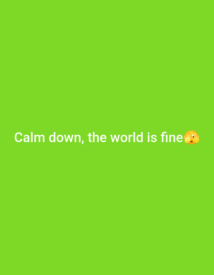 A light green background displays the text "Calm down, the world is fine" in white lettering