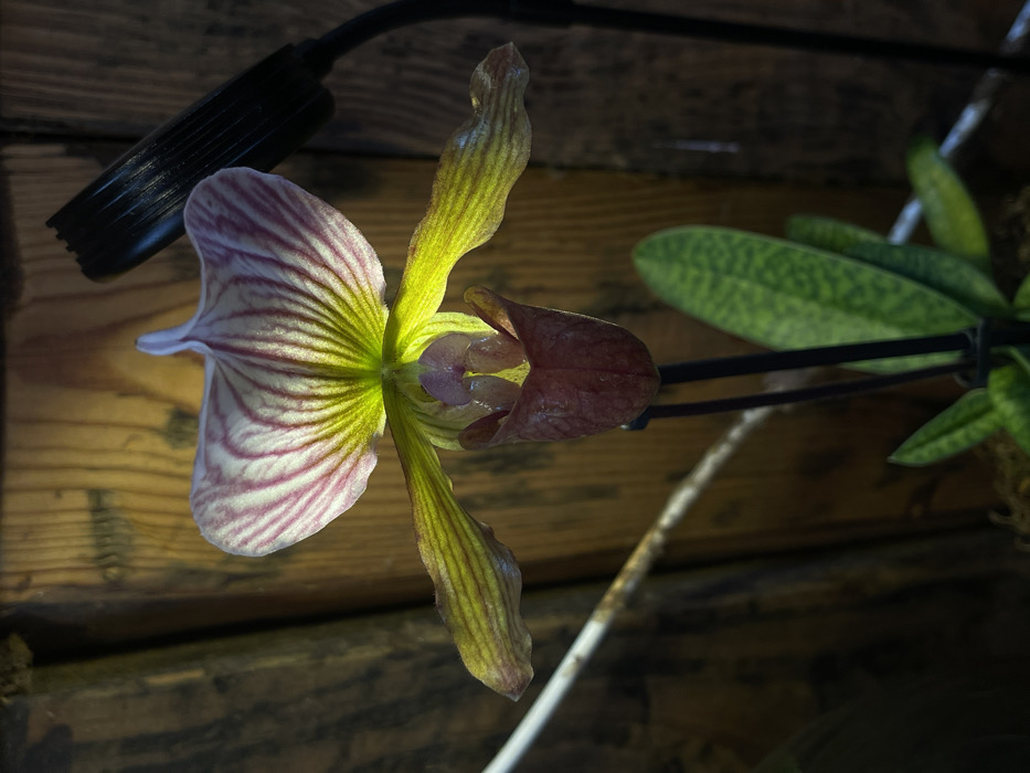 - "The image displays a close-up, artificially lit view of a single Paphiopedilum (slipper orchid) flower and its foliage, positioned against a vertical wooden plank background" by FM-lYn4w2, licensed under CC BY 4.0