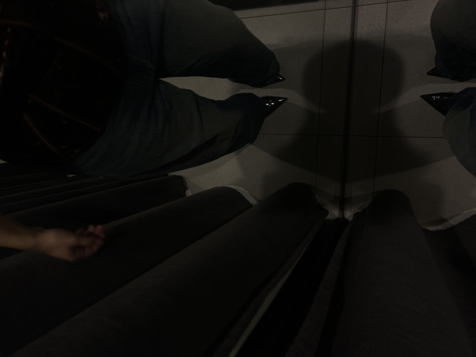 An indoor scene, likely a retail fabric store in Tbilisi, Georgia, is captured from a slightly elevated, downward-angled perspective. The specific location within Tbilisi is not discernible from the image. The lower half of an individual is centrally positioned, wearing dark blue denim jeans and black, patent-leather, pointed-toe shoes. The person stands on a light grey tiled floor, characterized by dark grout lines. To the left, multiple large rolls of dark-colored fabric, likely black or dark grey, are stacked vertically, revealing a white underside or core material at their bases. A reflective surface, appearing to be a floor-level mirror or highly polished floor, extends along the base of the fabric rolls and into the foreground, displaying a reflection of the individual's lower body and footwear. In the upper left quadrant, a human hand with a light brown skin tone is partially visible near the top of the fabric rolls. The lighting is dim, casting distinct shadows on the tiled floor, including a prominent shadow from the individual. No other individuals or explicit interactions are depicted.
