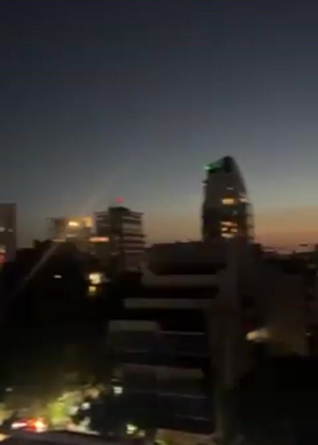 n evening cityscape at twilight from an elevated balcony. The sky is a gradient of dark blue to light orange on the horizon. Several buildings, some skyscrapers, dot the landscape, with lights on in some windows. The camera then pans to the right, revealing more of the cityscape with silhouetted buildings. Finally, the camera focuses on a nearby building with a brightly lit interior, where two people can be seen moving around. Palm trees are visible silhouetted against the night sky above the building.