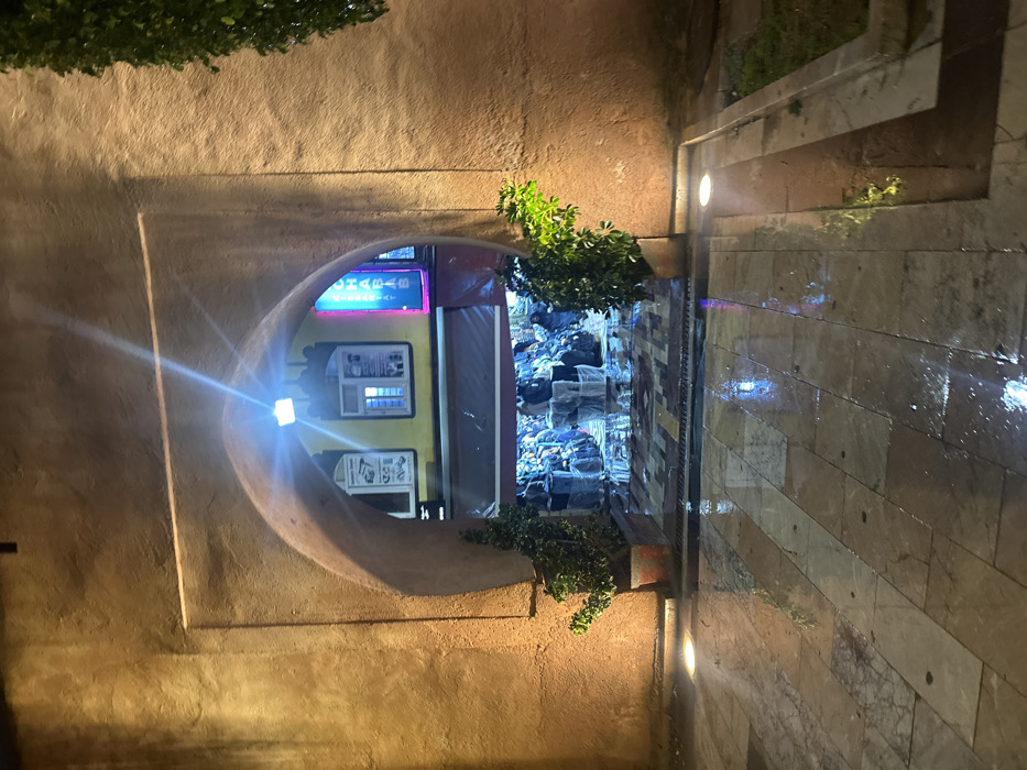 An eye-level shot reveals a round opening in a stucco wall, framing a store interior. The store's neon sign reads "CHAHABIS," and printed posters line the walls. Clothes are stacked high within. Plants flank the opening. A tiled walkway leads away from the opening, lit by recessed lights. The scene evokes a rainy or wet night.