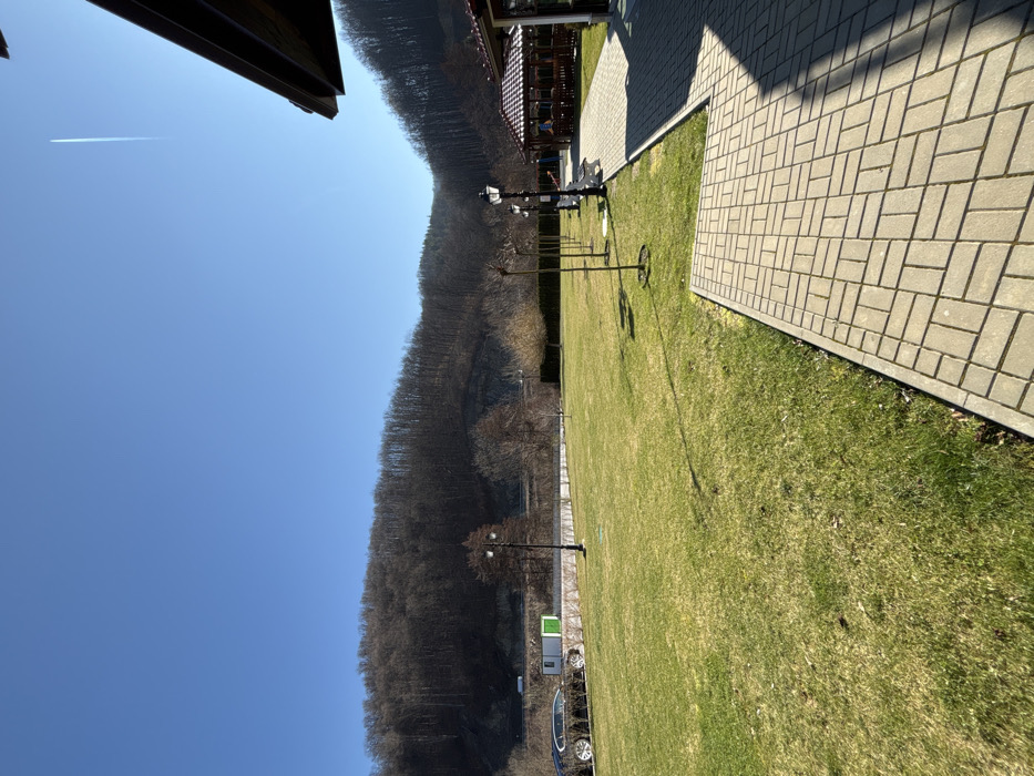 The image displays an outdoor scene in Gabrovo, Bulgaria, likely a recreational or restaurant area situated along the Е85/I-5 highway within the foothills of the Balkan Mountains. The sky is clear blue with a single jet contrail visible in the upper right quadrant. The background features densely forested hillsides covered with bare deciduous trees, indicating a late winter or early spring season. A highway or main road runs horizontally across the mid-ground, with a white truck partially visible. This road is bordered by a continuous white fence line, behind which several green and white container-like structures are present on the left. The central and left foreground is dominated by a large, well-maintained lawn of green grass. A dark-colored sedan is parked partially off-frame to the far left, adjacent to the white fence. Interspersed across the grassy area and along a paved pathway are several ornate, dark-colored street lamps. The foreground and mid-ground on the right side of the image feature a paved path constructed from light grey interlocking paver stones arranged in a herringbone pattern. Shadows from an unseen overhead structure extend across this paved surface. Adjacent to the paved area on the right, a wooden gazebo with a reddish-brown tiled roof is visible, containing tables and benches. A small playground area with colorful equipment, including a red slide and blue swings, is located near the gazebo, along with a white park bench. No individuals are visible in the scene.