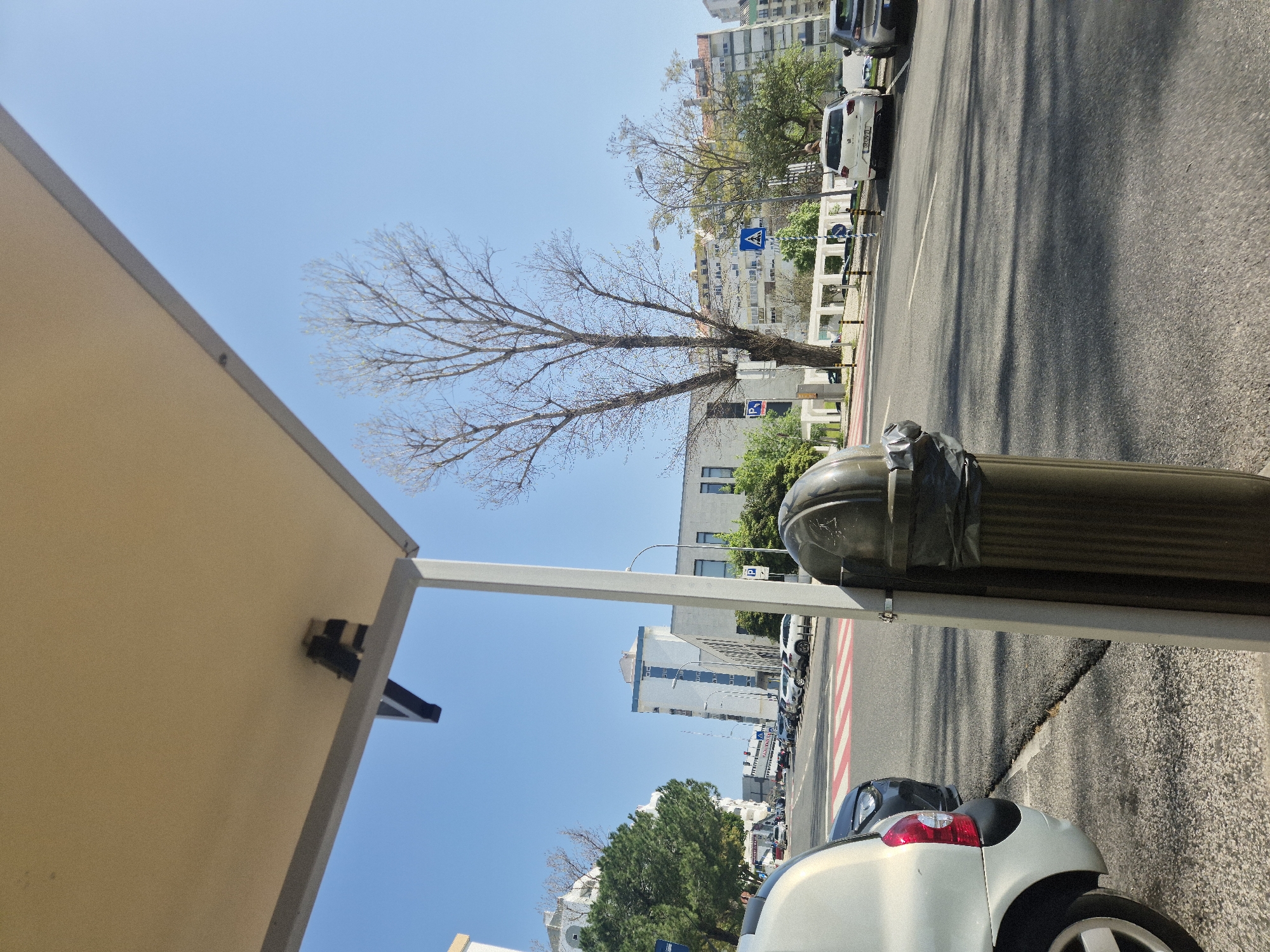 The scene depicts a sunny urban street view in Oeiras, Portugal, observed from beneath a light-colored overhead canopy or awning. In the immediate foreground, a metallic dark green fluted cylindrical trash bin with a visible black plastic liner is positioned on the right, secured to a light-colored vertical support pole. To the left of the bin, the rear quarter and wheel of a light silver passenger car are visible. The paved asphalt road extends into the midground, featuring a red and white striped pedestrian crosswalk directly in front of the viewpoint. White dashed lane markers are visible further along the road. Numerous passenger vehicles are parked along both sides of the street. On the right side of the road, a tall, bare deciduous tree stands prominently, its branches extending into the clear blue sky. Below the tree, a white modern sedan (license plate `38 DV 21`) is parked, and a blue square sign indicating a pedestrian crossing is visible. A street lamp post is also present on the right. In the background, multi-story buildings line the street. On the left, a white building with an arched architectural detail is partly visible, flanked by green trees. Further down the street on the left, a distinct multi-story building features a white facade with prominent blue vertical accents. Buildings on the right side of the street display lighter colored facades and reddish-orange tiled roofs. The sky is clear and cloudless, suggesting bright daytime conditions. No individuals are visible.