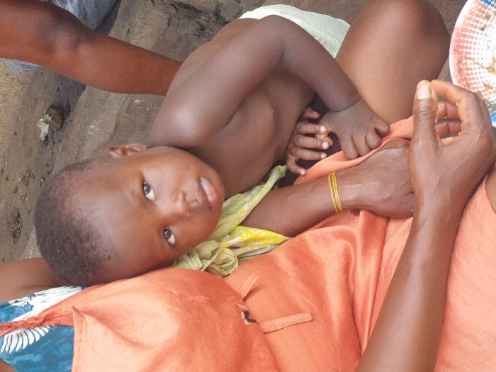 A baby with dark skin rests in someone's lap. The baby is facing toward the viewer, with a curious expression. The baby is wearing a yellow and white cloth. An arm with a yellow bracelet is visible, holding the baby. The person holding the baby is wearing an orange shirt. The background is out of focus and appears to be an outdoor setting.