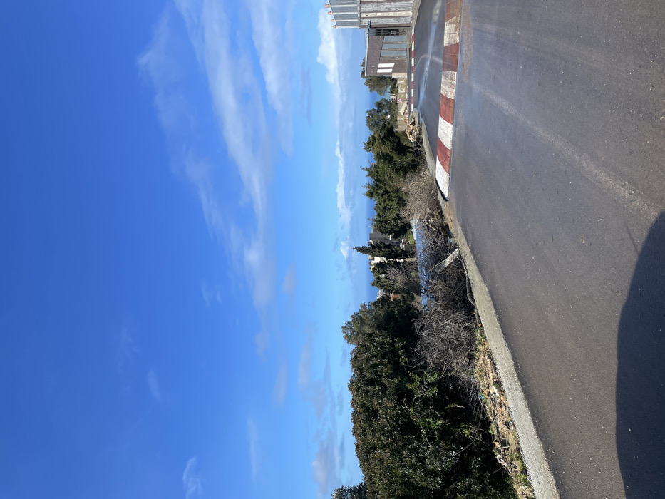 A curved road with red and white painted barriers edges a cliff. Below, trees and bushes line the hillside, with the ocean and a building visible in the distance. Above, a bright blue sky is scattered with wispy clouds. The pavement appears newly laid and slightly wet. A shadow is cast on the road.
