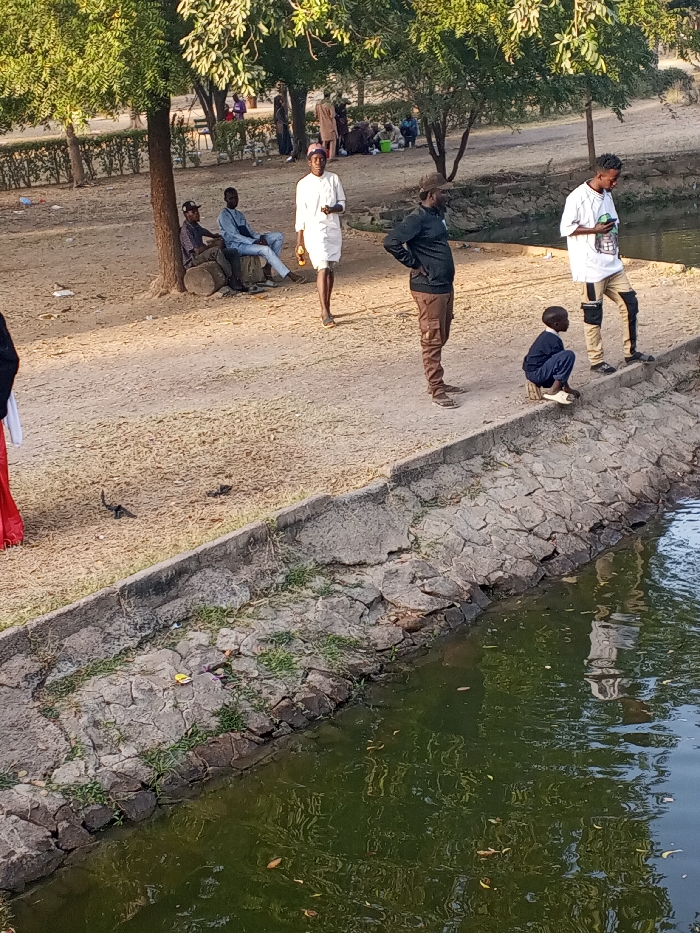A group of people gathers at a park, beside a pond. Two men are sitting on logs, while another in white attire walks by. Near the pond's edge, a man in brown pants stands, and a young child crouches. Another man stands nearby, looking at his phone. The pond is still, reflecting the surroundings. Trees and greenery provide shade, with more people seated in the distance.