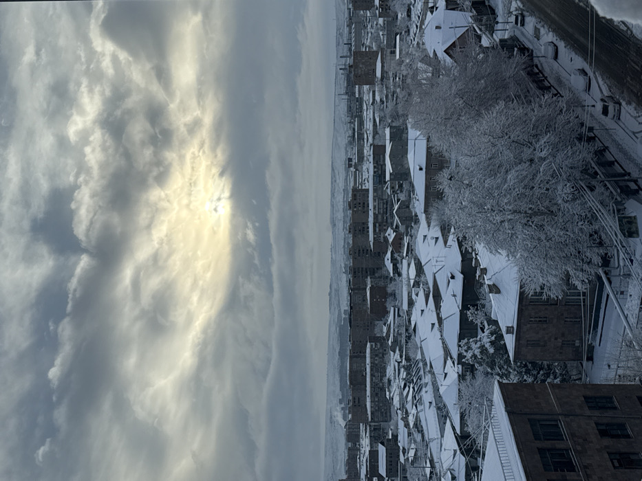 A high-angle view shows a cityscape blanketed in snow under a cloudy sky. Sunlight filters through the clouds, illuminating the scene. Buildings with snow-covered rooftops are densely packed. Bare trees covered in snow are visible along the street. The horizon is slightly obscured by the haze.
