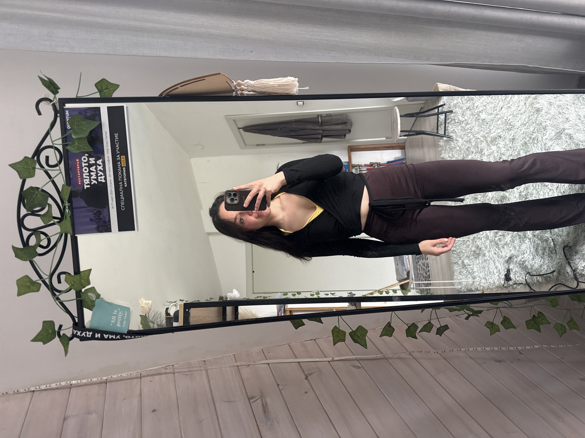 A person is taking a mirror selfie. The background includes a carpet, white walls, and a curtain. A sign attached to the mirror reads "Тялото, УМА И ДУХА," and mentions "София - Inter Expo Center," suggesting a location in or related to Sofia, Bulgaria, rather than Tvarditsa. The sign also contains the text "Специална Покана За Участие" and "Категория Gold." The mirror frame is decorated with artificial greenery. Another small sign says "All is pretty - Andy Warhol." A shelf with items is visible in the mirror's reflection.