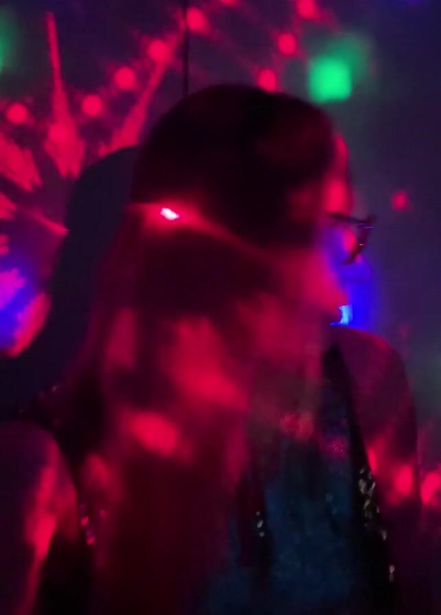 A person wearing glasses and a sparkly top dances to music under shifting colored lights