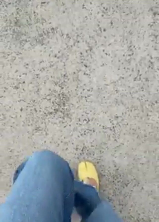 A person wearing light blue jeans and bright yellow shoes walks, taking steps on a gray, textured concrete surface. The shoes have a split toe design. The camera remains close to the person's feet and legs, providing a first-person perspective of the action. The environment appears to be outdoors, and the lighting suggests daytime.