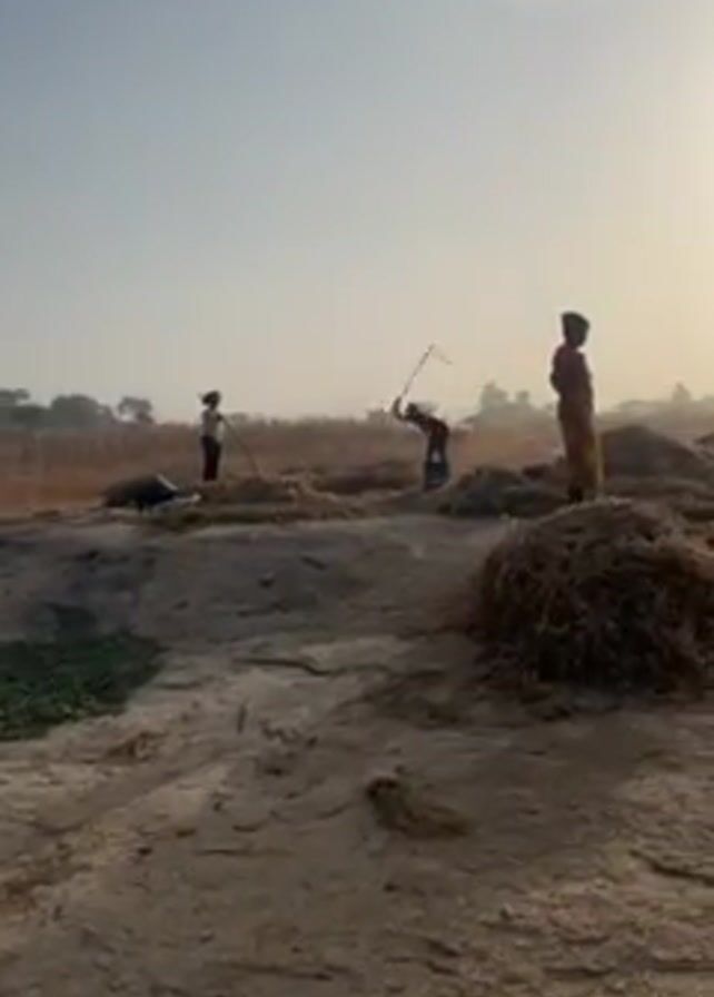The video depicts three people working in a rural, sunlit landscape. The ground is uneven and appears dry, with patches of sparse vegetation. Several piles of dried grass or hay are visible, along with what appears to be a dark, possibly burned, area. The individuals are using long sticks or tools to move or process the piles. They are relatively silhouetted against the bright sky, but appear to be wearing dark clothing and head coverings.