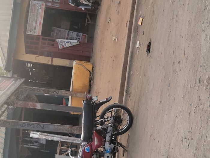 An outdoor scene shows a red motorcycle parked near a building with a storefront. The building has metal bars framing the entrance. Two posters hang on the front. The ground is dirt. Debris, including paper and other small objects, litters the ground. The picture appears rotated, as the background is tilted.