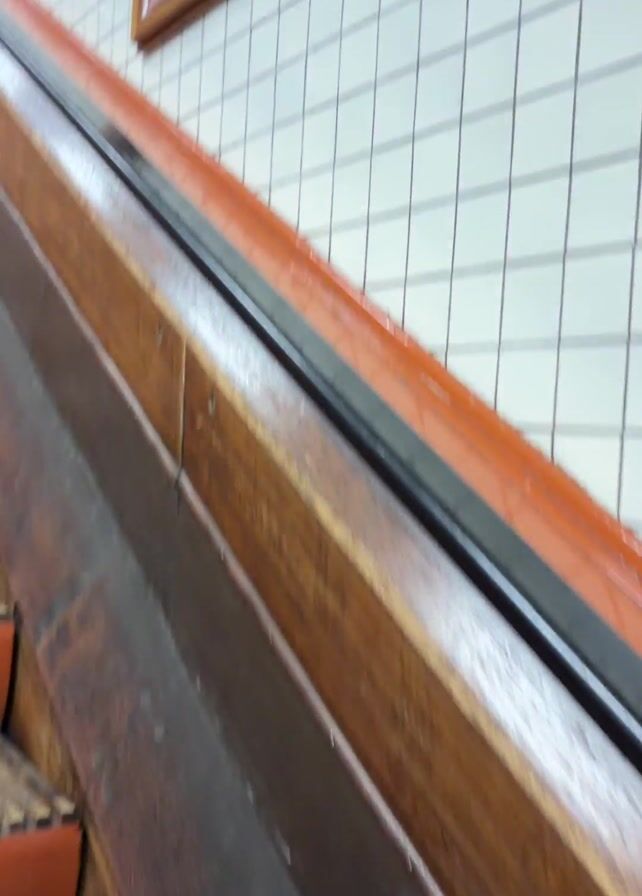 n upward moving escalator with orange steps. The side of the escalator has a brown wooden panel with a black handrail. The wall adjacent to the escalator is covered in white square tiles and has framed pictures hanging on it. A person is visible at the top of the escalator.