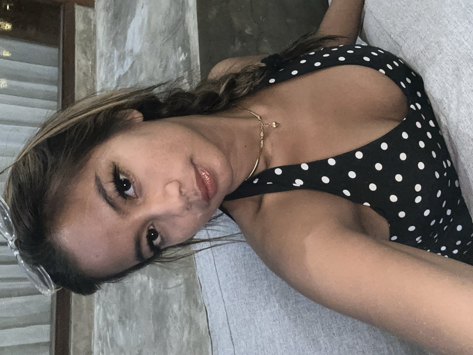 A female individual is depicted in a close-up, slightly high-angle indoor portrait in Tumbak Bayuh, Indonesia. She is positioned frontally, looking directly into the camera with a neutral expression. Her dark brown hair, featuring lighter highlights, is parted and styled with a visible braid resting on her left shoulder; clear-framed eyeglasses are pushed up onto her forehead. Her facial features include full eyelashes and glossy lips. She is wearing a black halter-neck top or dress with white polka dots. A gold-colored choker necklace, adorned with a small, pointed pendant, is visible around her neck. She is seated on a light grey, textured upholstered surface. The background is softly blurred, indicating an interior setting with indistinct light-colored curtains or wall coverings.