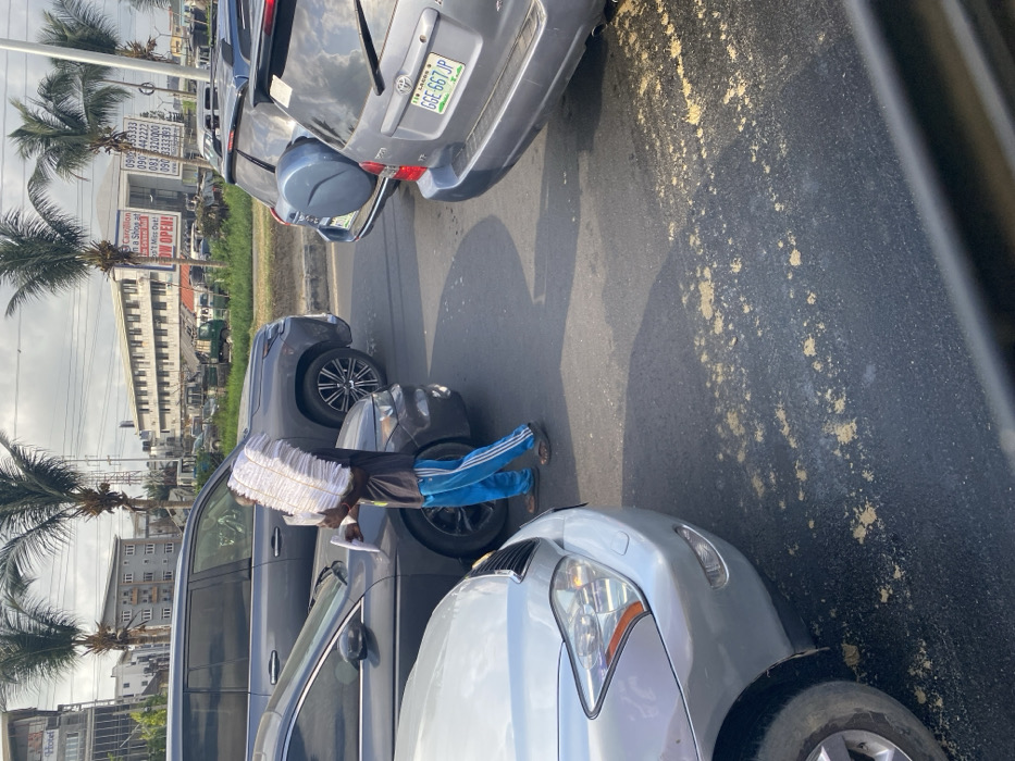 The image depicts a street scene in Jakande, Nigeria, characterized by moderate daytime traffic
