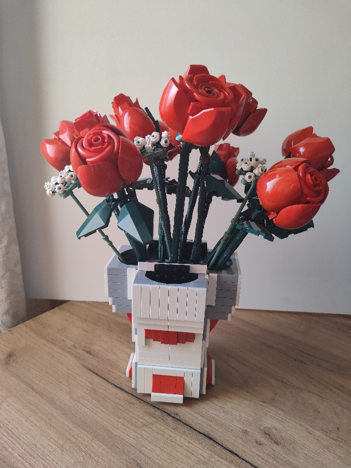 - "A static indoor photograph from Sofia, Bulgaria, displays a bouquet of artificial flowers constructed from LEGO bricks, set in a LEGO vase on a wooden surface" by FM-DY5YU2, licensed under CC BY 4.0