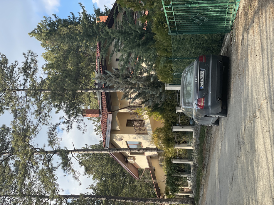 The scene depicts a residential property in Starozagorski bani, Bulgaria, under a partially cloudy sky. A multi-story house with light beige walls and a reddish-brown tiled roof dominates the middle ground. The house features a second-floor balcony with an ornate dark metal railing on the right side and an exterior air conditioning unit mounted on the left facade. Two brick chimneys rise from the roof. Tall pine trees densely populate the background and surround the property, with additional green coniferous and deciduous shrubs planted along the perimeter. A low fence, consisting of cream-colored concrete pillars and dark metal sections, separates the house from the foreground. To the right, a taller green metal fence or gate is visible. On an asphalt road in the foreground, a dark grey Audi A6 sedan is parked, facing away from the viewer. The vehicle's rear license plate displays "CT 6761 BB." No people are visible.