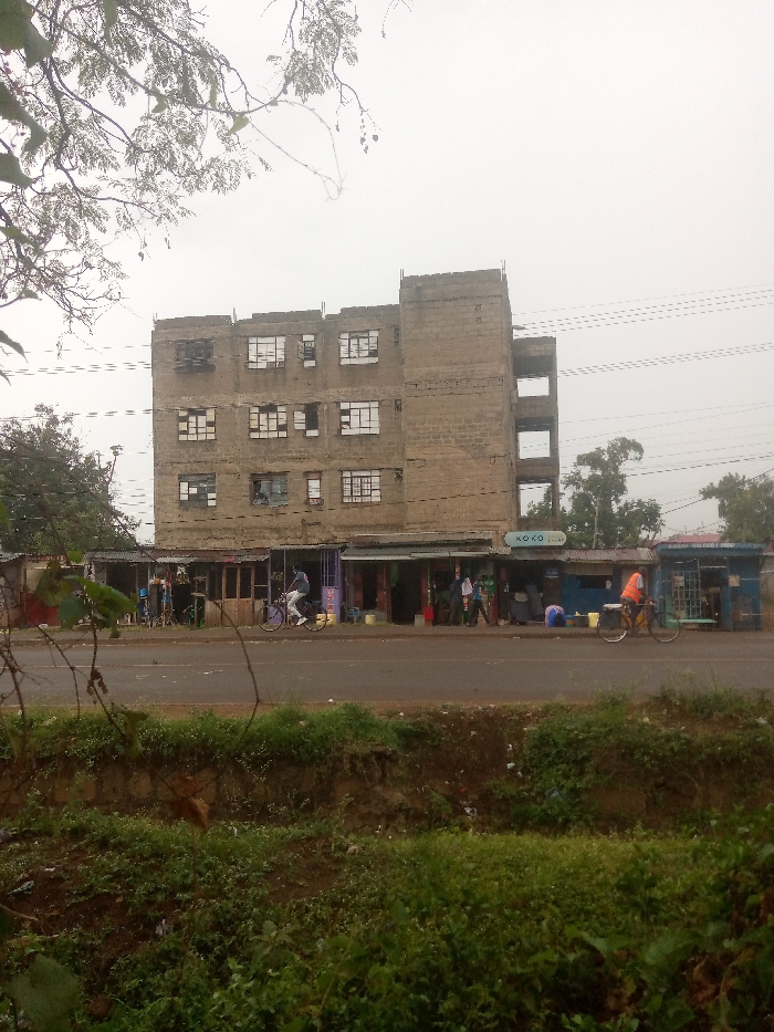 This image depicts an outdoor urban scene in Kisumu, Kenya, under an overcast sky. The background features a five-story building constructed of light-colored concrete blocks. This structure exhibits numerous window openings, many of which contain incomplete or missing frames. The building's right side reveals an unfinished open-air stairwell or set of balconies, characterized by three visible open, rectangular recesses. At ground level, a continuous series of single-story retail establishments lines the street. One shop prominently displays a blue and white "KOKO FOOD" sign. The immediate foreground consists of a vegetated earthen embankment and a parallel ditch, with branches and light green foliage from an unseen tree partially obscuring the upper-left portion of the sky. A two-lane paved road occupies the midground of the image. Two individuals are observed cycling on this road, both traveling from left to right. One cyclist wears a light-colored shirt and dark trousers, riding a dark bicycle. The other cyclist wears a bright orange vest over a dark top, riding a yellow bicycle. Multiple pedestrians are present on the sidewalk adjacent to the retail establishments, with some individuals gathered near the "KOKO FOOD" shop. Several utility lines traverse the upper-midground horizontally.