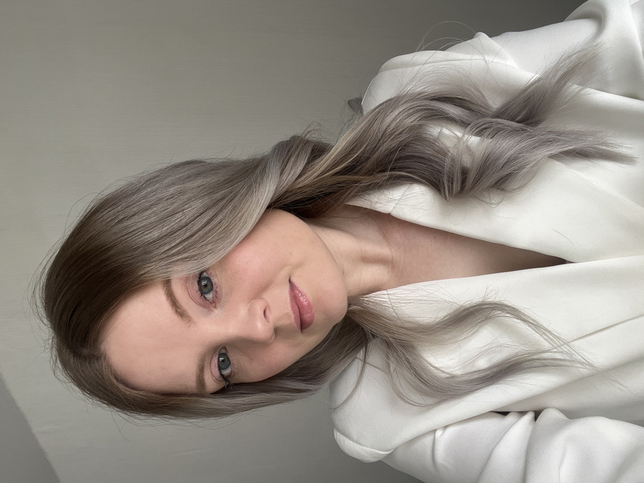 The image displays a close-up portrait of a young adult female, positioned indoors in the city of Chaikovsky, Russia. The subject has a fair complexion, light blue-green eyes, and long, wavy hair that transitions from a natural brown at the roots to ash blonde or greyish tones towards the ends. She is wearing a white V-neck blazer. The woman maintains direct eye contact with the camera, exhibiting a neutral facial expression. The background consists of a plain, light-colored wall, providing no additional environmental details.