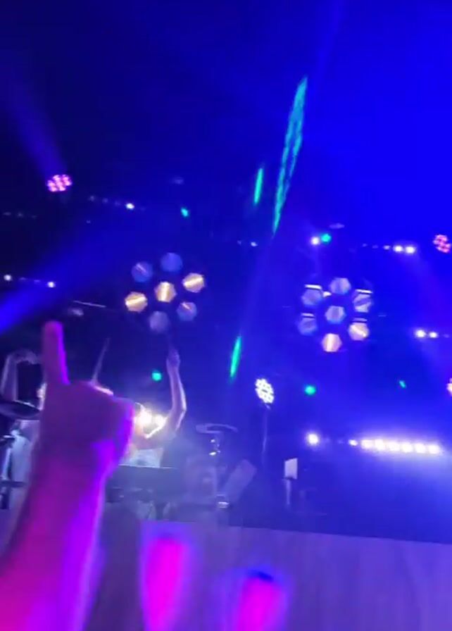 live music performance at what appears to be an outdoor venue. At the start, an arm is raised in the foreground, partially obstructing the view of a DJ or conductor on a stage, who is using a baton. The stage is lit with bright stage lights, including green and yellow hexagonal patterns. The next shots shift to the crowd, showing people raising their arms and dancing under flashing purple, blue, and green lights. There's some fog or smoke in the air adding to the atmosphere. Several people are visible, primarily dancing, with some blurred movement suggesting an energetic environment. The camera moves around showing different parts of the crowd. The overall setting suggests a lively, festive occasion.
