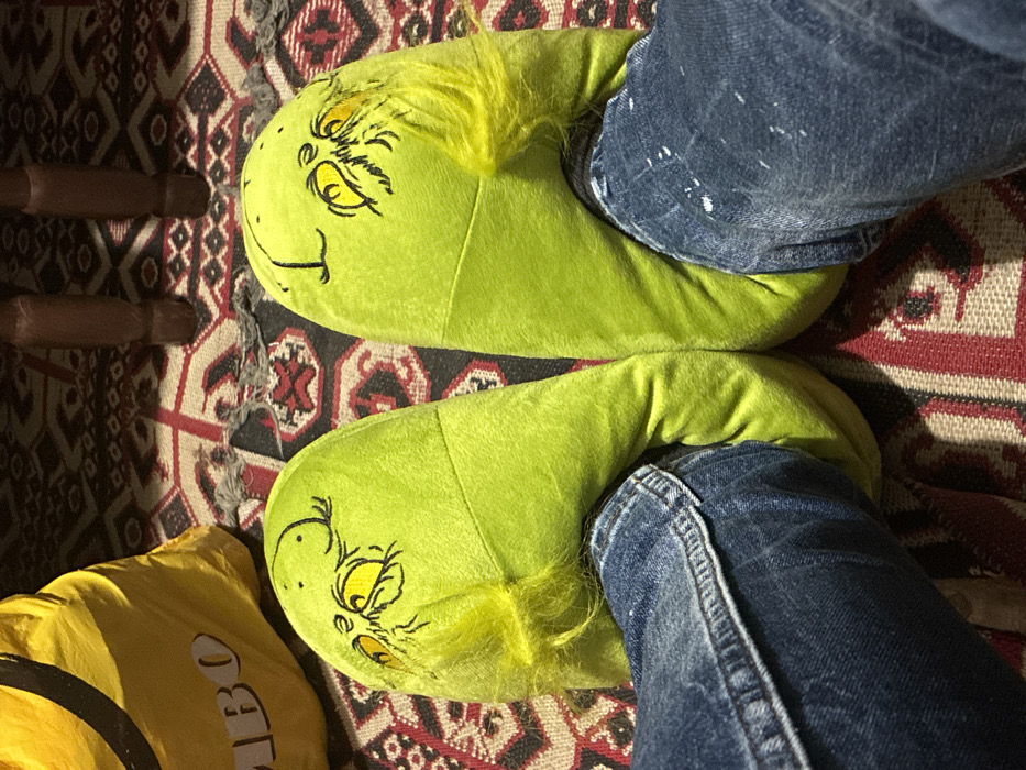 The image presents a high-angle view of a person's lower legs and feet, located indoors on a patterned rug in Gorna Oryahovitsa, Bulgaria. The individual is wearing blue denim jeans, which display visible wear and white paint or splatter marks, particularly on the right leg. Both feet are clad in bright lime-green plush slippers, each featuring an embroidered design of a character's face, consistent with the Grinch, complete with yellow eyes, black outlines, and ruffled yellow fur. In the upper left background, a yellow fabric bag with the word "JUMBO" printed in black is partially visible. To the upper right, the lower sections of two dark-brown wooden furniture legs are present. The rug underneath is characterized by a geometric pattern in red, black, and off-white, and exhibits some frayed edges.