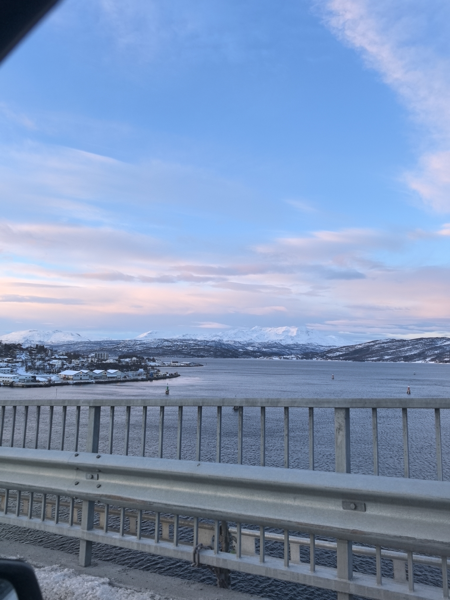 The image depicts a winter landscape captured from a vantage point on the Finnsnes Bridge, looking eastward across the Gisundet strait towards the city of Finnsnes and the surrounding mountainous terrain in Norway. In the immediate foreground, a metallic bridge railing and a highway guardrail run horizontally across the lower third of the frame. The railing consists of multiple vertical bars supporting a horizontal top rail, while the guardrail is a solid, corrugated metal barrier. Patches of white snow and ice are visible on the bridge surface immediately below the guardrail, particularly in the lower left corner. A dark, out-of-focus object, possibly a vehicle's dashboard or window frame, encroaches from the bottom left. The midground is dominated by the dark, choppy waters of the strait, exhibiting ripples indicative of movement. Several navigational markers are visible on the water: a green buoy is positioned closer to the Finnsnes shore on the left, and at least two red and white pole-like markers are further out in the strait, towards the right and center. On the left side of the image, beyond the water, lies a section of Finnsnes city. Numerous buildings, predominantly white or light-colored, are clustered along the shoreline and extend up a snow-covered hillside. Some structures appear industrial or commercial, while others are residential. Snow blankets the ground and roofs of these buildings, and bare trees with traces of snow are interspersed among them. In the far background behind the city, large, snow-capped mountains rise sharply. The background across the entire horizon features extensive snow-covered mountains. Their rugged peaks and slopes are entirely covered in white, contrasting with the dark patches of forest at lower elevations. The sky above is a gradient of clear blue at the zenith, transitioning to soft pink and pale orange hues near the horizon, indicative of twilight (either sunrise or sunset) or specific winter lighting conditions. Sparse, wispy clouds are scattered across the sky, reflecting these subtle colors. No people or active vehicles are visible in the scene.