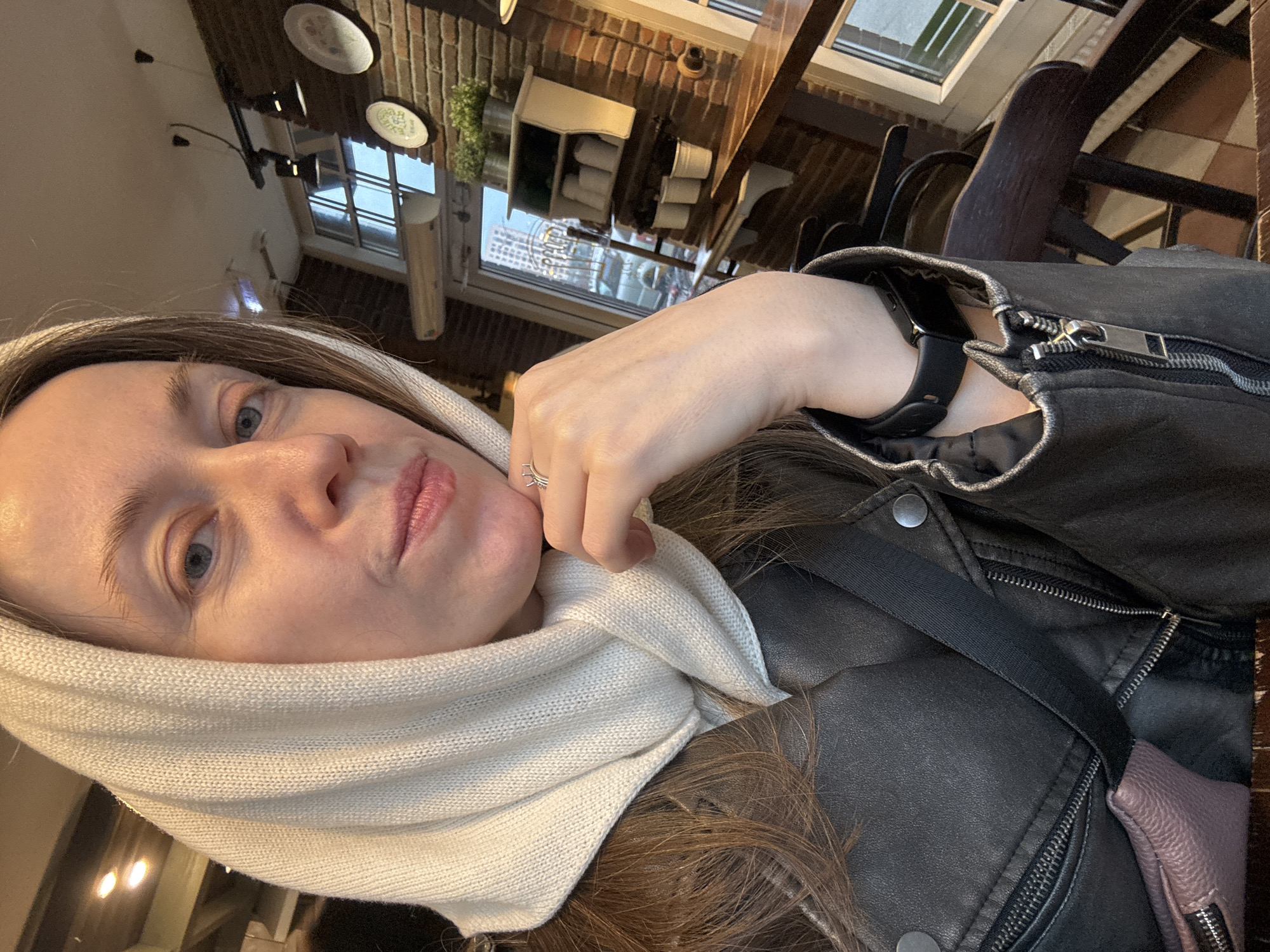A selfie taken indoors by a fair-skinned person with brown hair and blue eyes, who is wearing a white knit scarf covering their head and most of their face. They are also wearing a black leather jacket and a smart watch. The background shows a view of Kudrovo, Russia through a window, including brick buildings, dishes on a shelf, and tables and chairs. The image is rotated counter-clockwise.