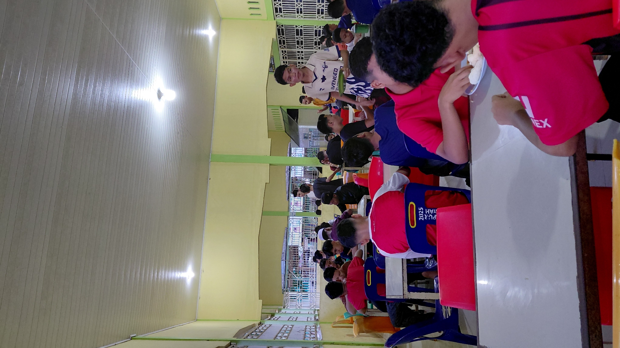 group of people, mostly young males, seated at long tables in what appears to be a mess hall or cafeteria. The location is Lhokseumawe, Indonesia, based on the text visible on the chairs. The walls are a light yellow color and the ceiling is white. Some people are eating from plates at the tables, while others are standing and talking. The scene suggests a gathering or meal event, possibly associated with a school or organization.