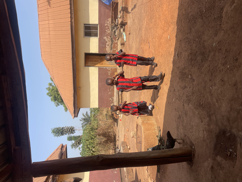 The image depicts three young children walking across a reddish-brown dirt compound in Oturkpo, Nigeria, under a clear, bright blue sky. The scene is viewed from beneath a covered area supported by dark wooden beams. **People:** * Three children, estimated to be between 2-5 years old, are walking from left to right across the midground. * The child on the far left is a female, wearing a red and black vertically striped dress over a white or light-colored skirt and dark shoes. Her hair is styled in small braids or buns with visible colorful bands. She has a neutral expression. * The middle child is a male, wearing a red and black vertically striped short-sleeved top, dark trousers, and dark shoes. His right hand is raised, touching his temple or ear. * The child on the far right is a male, wearing a red and black vertically striped short-sleeved top, dark trousers, and dark shoes. His left hand is near his chin. * All three children are in motion, walking towards the right side of the frame. **Objects and Environment:** * In the immediate foreground, a dark-feathered chicken walks towards the left, positioned near a vertical wooden support beam. * The ground is dry, reddish-brown earth, showing minor undulations and scattered small debris. * To the left of the children, a square concrete well or cistern with a metal pump handle mechanism is visible. A green hose or cable lies coiled partially on the ground nearby. * In the background, two single-story buildings are visible. The main building on the right features light yellow upper walls, a dark brown lower wall, and a reddish-orange corrugated metal roof. It has a central wooden door and a rectangular window with a security grill to its right. A long wooden bench is positioned below the window. * A second, similar building is partially visible on the far left, exhibiting the same color scheme and roof type. * Between and behind the buildings, various trees and sparse vegetation are present, indicative of a semi-rural setting. * The sky is clear and bright blue, suggesting sunny weather. The lighting indicates direct sunlight, casting subtle shadows.