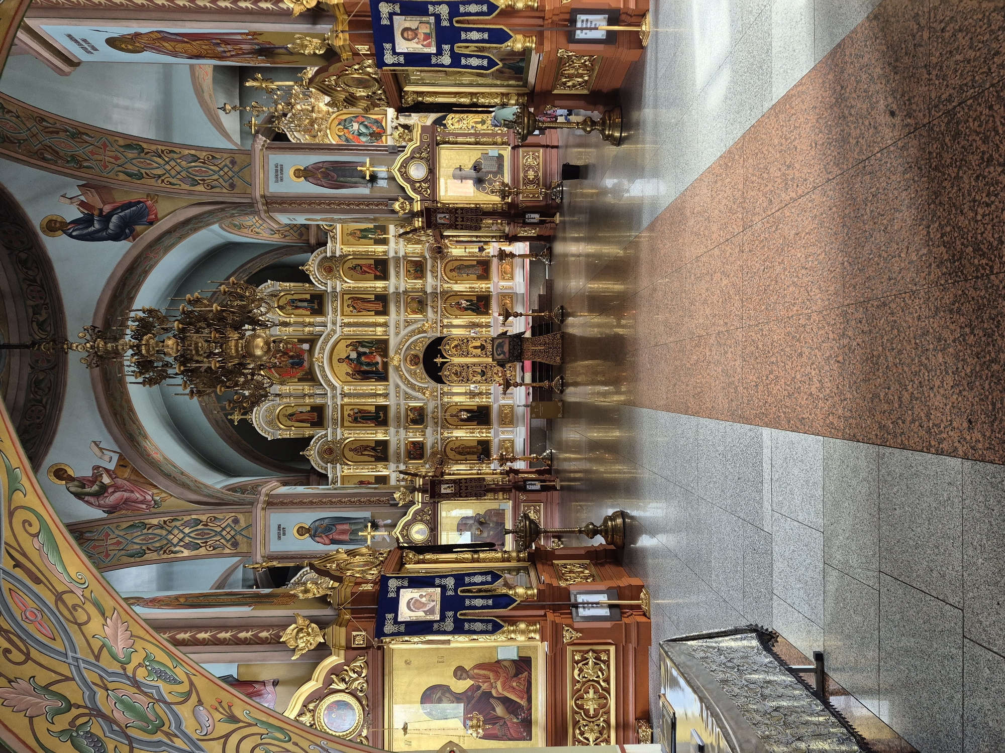 The image displays the interior of an Orthodox Christian church in Chaikovsky, Russia, viewed from the nave looking towards the iconostasis. The floor is composed of polished granite tiles, with light gray speckled tiles forming the majority of the visible surface and a distinct reddish-brown speckled aisle running centrally towards the altar area. In the foreground on the left, a long, narrow table is draped with a silver and dark patterned cloth, with several books or papers resting on its surface. To the right of this table, a large icon of the Theotokos and Child is displayed on a gilded wooden stand. Adjacent to it, a dark blue velvet banner with gold fringe and an embedded icon of the Theotokos and Child hangs from an ornate pole. Several brass candelabras, some with candles, are positioned on the floor near various icon stands. The central feature is a multi-tiered, highly gilded wooden iconostasis at the far end, containing numerous framed icons depicting saints and biblical scenes. The Royal Doors are centrally located within this structure. To the right of the central aisle, another dark blue velvet banner with an embedded icon of Christ Pantocrator is visible, along with additional icons on gilded stands. A small black bucket rests on the floor near a candelabra on the right side. The church interior features light blue vaulted ceilings and arches adorned with intricate gold, green, and red floral and geometric patterns. Frescoes depicting figures, such as saints writing on scrolls or books, are painted on the arches and pillars. Multiple ornate, gold-colored chandeliers hang from the ceiling. The polished floor reflects the ceiling decorations and structures within the church. A faint, indistinct human figure is partially visible in the far background near the right side of the iconostasis.