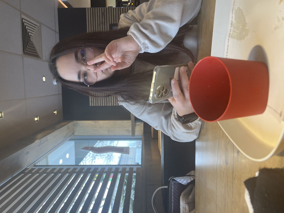 An interior image depicts a young female individual seated at a light-colored wooden table within what appears to be a fast-food restaurant, identified as McDonald's, located in Oberhausbergen, France. The female, centered in the frame, has long dark hair and wears round-frame eyeglasses. She is dressed in a light-colored, long-sleeve top and a dark watch on her left wrist. Her left hand holds a silver-colored smartphone with a multi-lens camera module and a clear case. Her right hand forms a "peace" sign (V-sign), with her index and middle fingers extended, and her thumb resting near her nose bridge. She looks directly at the camera with her lips slightly puckered. In the immediate foreground on the table, a red, angled plastic cup rests on a white serving tray which exhibits minor residue. To the left of the individual, a light-colored bag is visible on the dark booth seating. The background features large windows with horizontal blinds on the left, revealing an exterior scene with trees, what appears to be a snow-dusted ground, and a distinct red, stylized hand sculpture (part of the McDonald's branding). The interior ceiling has white tiles, recessed lighting fixtures, and a square air vent. Dark paneling lines the walls in the background.