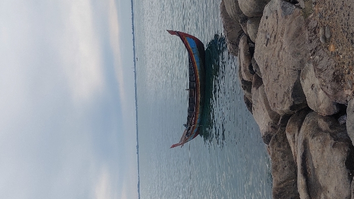 The scene depicts an outdoor coastal or lakeside environment under an overcast sky. In the foreground, large, irregular grey rocks line the lower right portion of the image, forming a rocky shoreline or breakwater. The water, a calm blue-grey, occupies the midground. A single, traditional-style wooden boat is centrally positioned in the water, appearing to be anchored or adrift. The boat features a high, pointed bow and stern, and its hull is painted with weathered stripes of red, blue, and dark brown. In the background, the body of water extends to a distant, low-lying landmass visible as a faint dark line on the horizon, with subtle indications of industrial or urban structures. A small, dark, indistinct object, possibly another boat, is barely discernible on the water near the distant land. The sky above is entirely overcast with soft grey and white cloud formations. No individuals are present in the image. The location is an unknown coastal or lakeside area within the city of Unknown, Unknown.