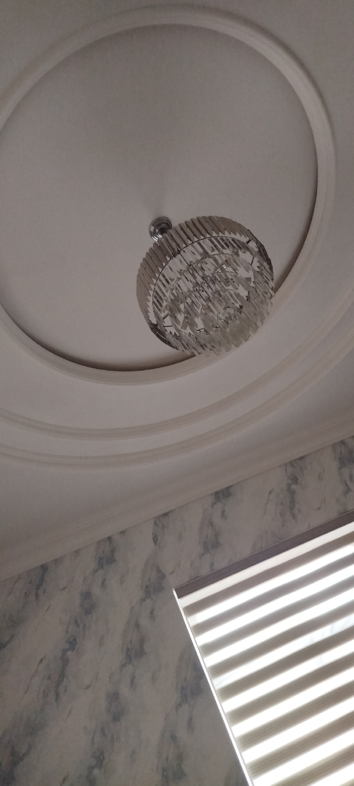 The image displays an interior scene, likely a residential or commercial room in Tashkent, Uzbekistan. The upper section is dominated by a white ceiling featuring two concentric circular moldings. A modern chandelier is centrally suspended from the ceiling; it is cylindrical with multiple horizontal tiers of clear, rectangular, faceted elements, possibly crystal or glass, attached to a chrome-finished base. Below the ceiling molding, a wall is visible, covered in wallpaper or a finish depicting a mottled grey and white marble-like pattern. In the lower right corner, a vertical section of a window is apparent, covered by a horizontal zebra blind. The blind shows alternating horizontal opaque and translucent stripes, with light shining through the translucent sections from an external source, indicating daytime. No individuals or active interactions are depicted.