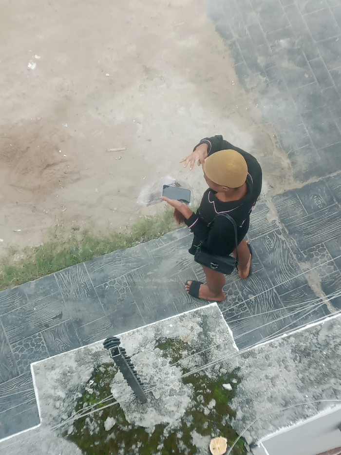 The image, captured from an elevated perspective looking downwards, depicts an outdoor scene in Igrwre-Ovie, Nigeria. A single individual is positioned on a dark gray, textured paved surface, which features a repeating patterned design. The individual is observed wearing a tan-colored head covering, a black long-sleeved shirt or dress with light-colored piping along the seams, and black slide sandals on bare feet. A black shoulder bag is slung across their body, resting at their left hip. The individual holds a dark-colored smartphone horizontally in their left hand, with the screen facing upwards. Their right hand is raised to approximately shoulder height, with fingers extended and splayed. Adjacent to their left hand, on the ground, is a translucent plastic bag containing an unidentifiable dark material. Immediately behind the individual, a narrow strip of green grass separates the paved surface from an unpaved, light brown ground area. This unpaved area contains scattered debris, including small white fragments, dark material, and a single wooden stick. In the foreground, below the individual's position, is a concrete structure with a white trim along its edge. This concrete surface exhibits patches of green moss or algae growth. A dark, vertically oriented, ribbed object, possibly a part of a railing or utility fixture, is mounted on this concrete. Several thin, light-colored lines, consistent with wires or string, extend horizontally across the concrete structure. A small, circular, light-colored object, possibly organic matter, is also visible on this foreground concrete.