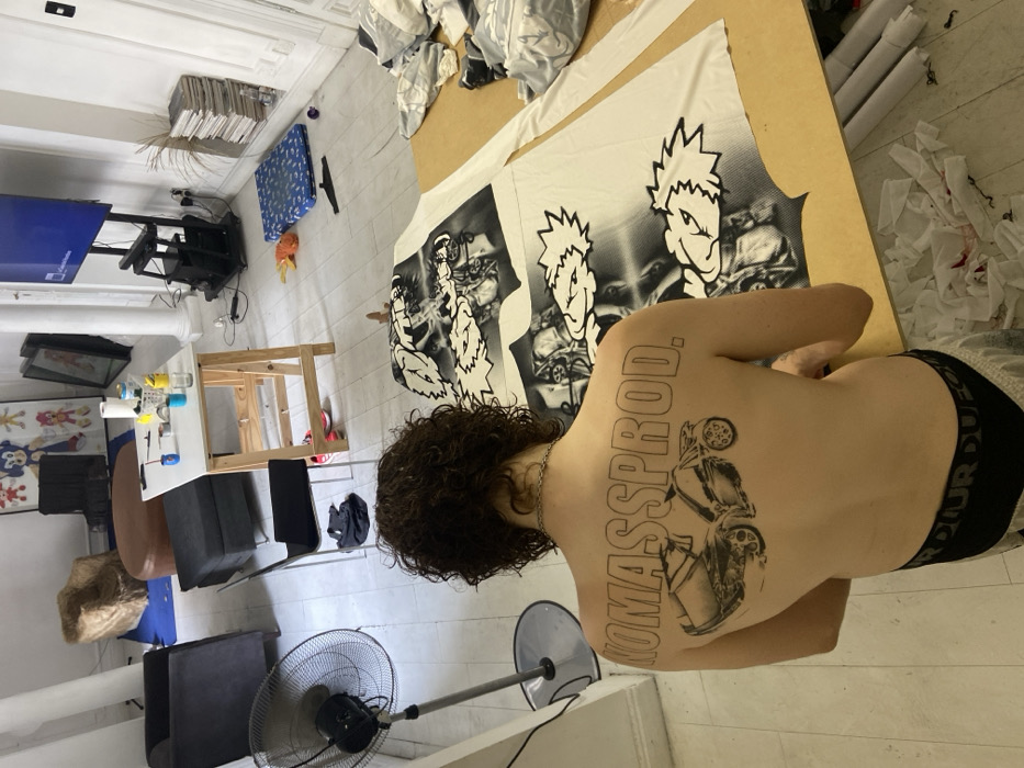 A person stands shirtless in a room with a large cartoon graphic print. The individual has curly brown hair and a tattoo on their back depicting "NOMASSPROD" and a motorcycle. The room contains various objects, including a table with artwork, chairs, a fan, and a television setup. Rolls of paper or fabric are seen in the background.